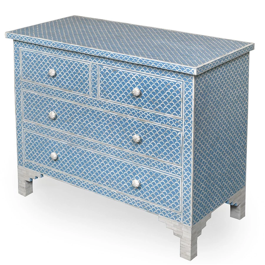 Bring this unique chest to your beachside home. The Hamptons Chest features a hand laid blue and white fish scale pattern of bone inlay. This four drawer chest is ideal for a bedroom, entryway or living area. Top with a chic lamp and an accent piece to complete your coastal decor.