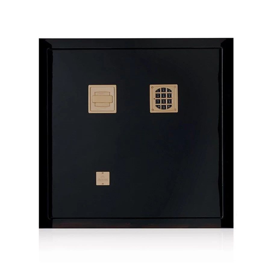 This grad 2 safe comes in shiny black steel. It contains 6 lined drawers, a necklace bar, and brass plated 24k gold accessories. Also, unique features include; high-level steel with several layers of chrome carbides for straightening, internal hinges, and an anti-tear profile on the doors. The safe is in compliance with grade 3 and is handmade in Italy.
