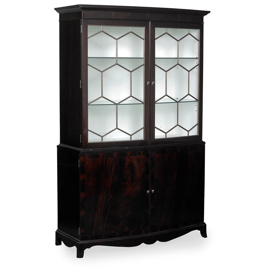 Gorgeous cabinet of bow front form with shaped base rail and flared foot. Two framed glass doors with honeycomb patterned mullions. Two adjustable glass shelves and lighted interior in display area. Lower doors in swirly mahogany with crotch mahogany cross banding. Two pull out trays with silver liner and one adjustable wood shelf behind doors. Handmade in America.
