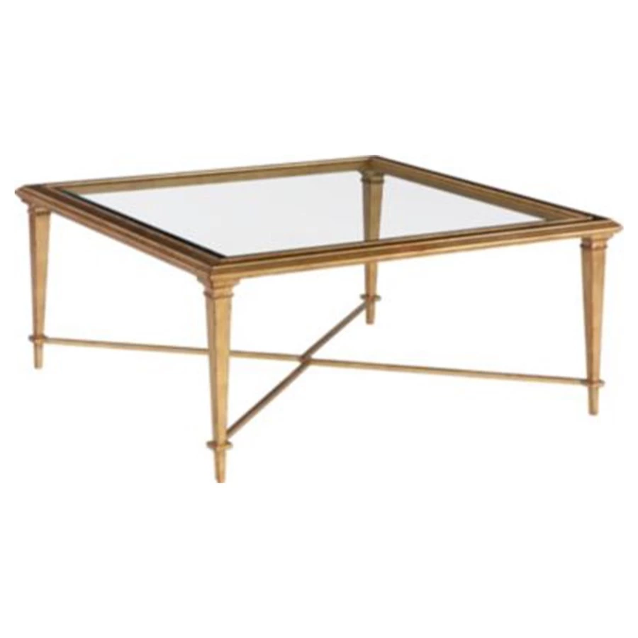 These glamorous tables are made of metal and hanpainted with antiqued gold leaf for a beautiful patina finish. The lift-out glass surface has a beveled border. The four square tapered legs terminate in spade feet and are joined by an X-stretcher for additional style and stability. The table is easily cleaned with just a soft clean cloth.