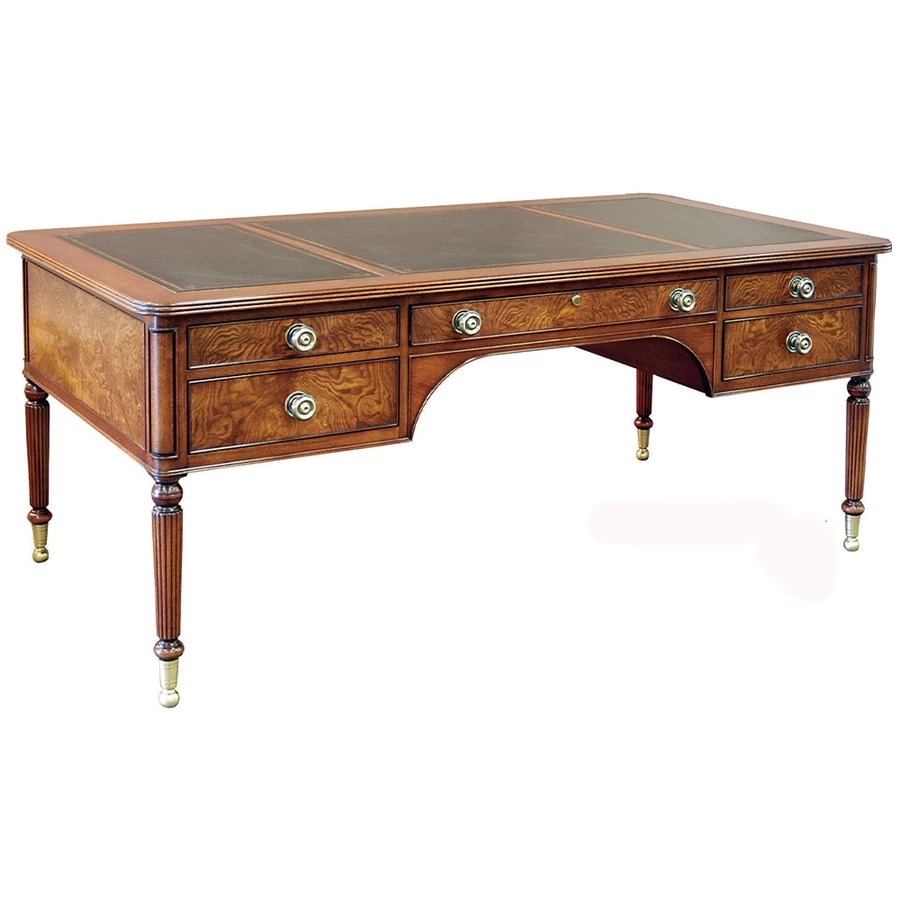 Handcrafted of mahogany and burl olive ash veneer, this elegant desk has practical partitions in all drawers, a sliding writing panel in top drawers, pencil tray in center drawer, a central locking device, turned and reeded legs with brass ferrules and solid brass hardware. The top features three leather panels with wood dividers strips between them and gold tooling. Handmade in America.