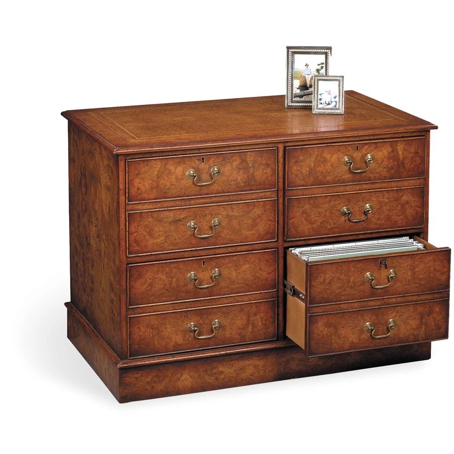 Quite possibly the best-looking file cabinets ever. Made by master craftsmen in England exclusively for Scully & Scully. Burr elmwood has rich antique finish (including the back) and gold-tooled brown leather top. File drawers, fitted for legal-size hanging folders, individually lock with key. Solid brass drawer pulls.