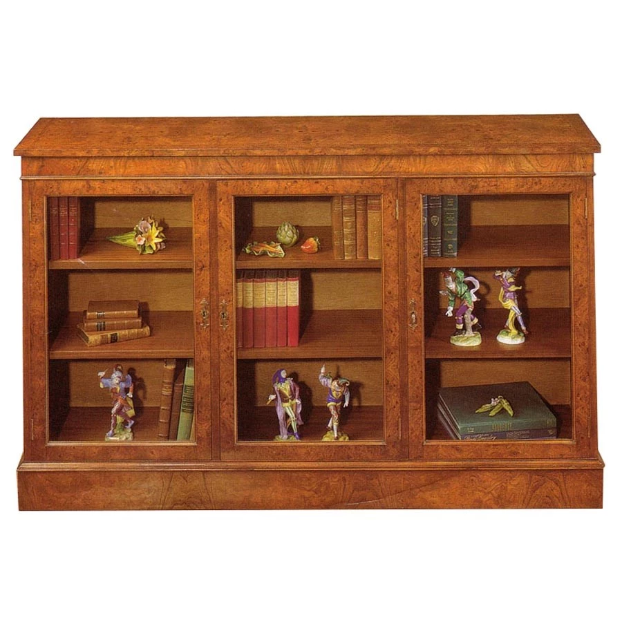 This useful and handsome burl elm piece with three glass doors shows well in a living room, a library, a den or even a foyer, More than a bookcase, this is an exemplary piece of fine furniture, ideal for displaying favorite collectibles. As versatile as it is beautiful, it will become am heirloom very quickly. Handmade in England. Exclusively at Scully & Scully.