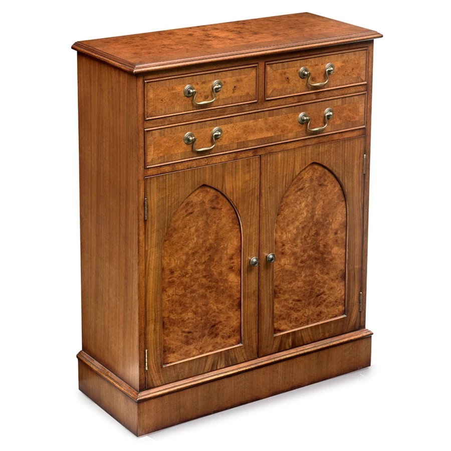 Elegant handcrafted burr walnut cupboard with gothic arch front detailing includes either one drawer or three drawers for easy and generous storage. One adjustable shelf behind doors. Bottom is shaped over a solid wood plinth base. Handmade in England. Exclusively at Scully & Scully.