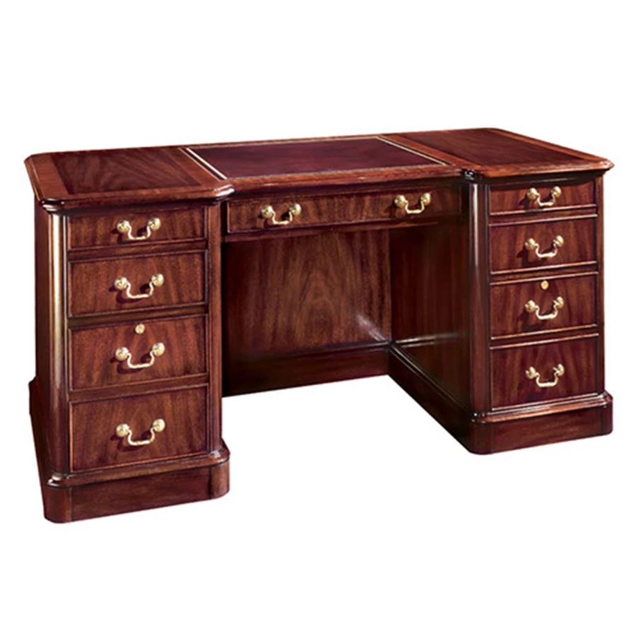 Bring timeless style and charm to your worklife with the Cathedral Mahogany Executive Desk. The reverse breakfront top is triple-sectioned with cathedral figured mahogany veneer and ribbon stripe border, as are the drawer fronts, ends, and modesty panel. The ample drawers include a metal support system for hanging files on both sides with solid brass grommets. The left pedestal contains a small box drawer with a pencil tray, a large open drawer, and a locking file drawer. In the center drawer is a pencil tray. The right pedestal contains a small box drawer with a writing slide, a large partitioned box drawer, and a locking file drawer. Solid brass hardware adds to the durability, making each last for generations with timeless swan neck handles. Pedestals equipped with levelers. Handmade in America by the finest craftsmen.