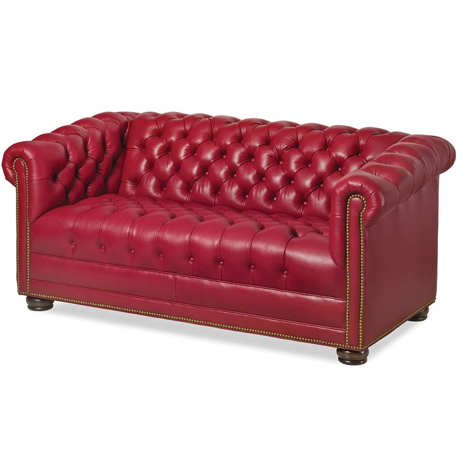 Entirely handmade by master craftsmen in America. The top grain leather and special cushioning are carefully selected to retain their shape while remaining soft and comfortable. The springs are hand-tied for increased durability. The wood is mahogany, hand-carved and hand-sanded to a silky touch.