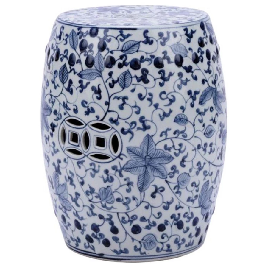 Traditional blue & white Chinoiserie motif features elegant vines winding around this practical garden seat. Useful as occasional seating, a fabulous side table, or simply a timeless design feature. Delicately detailed hand painting on a handmade Chinese porcelain garden seat, beautiful and useful.