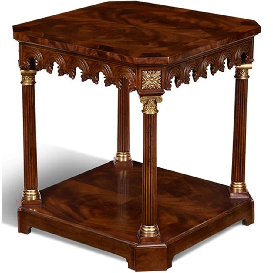 Exceptionally built, this end table is handcrafted from mahogany with fine crotch mahogany veneers to prevent warping. The squared off corners add thoughtful detail, complemented by stunning handcast brass panels and handcarved apron demilunes. The four reeded and turned legs are topped by brass capitals.