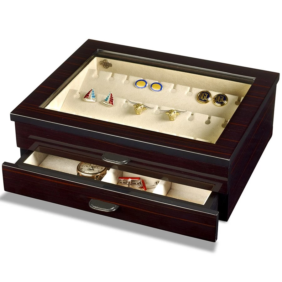Highly polished box handmade in Italy with painstaking workmanship. Upper drawer has thirty openings; lower drawer has one large and six small compartments. Leather tab drawer pulls.