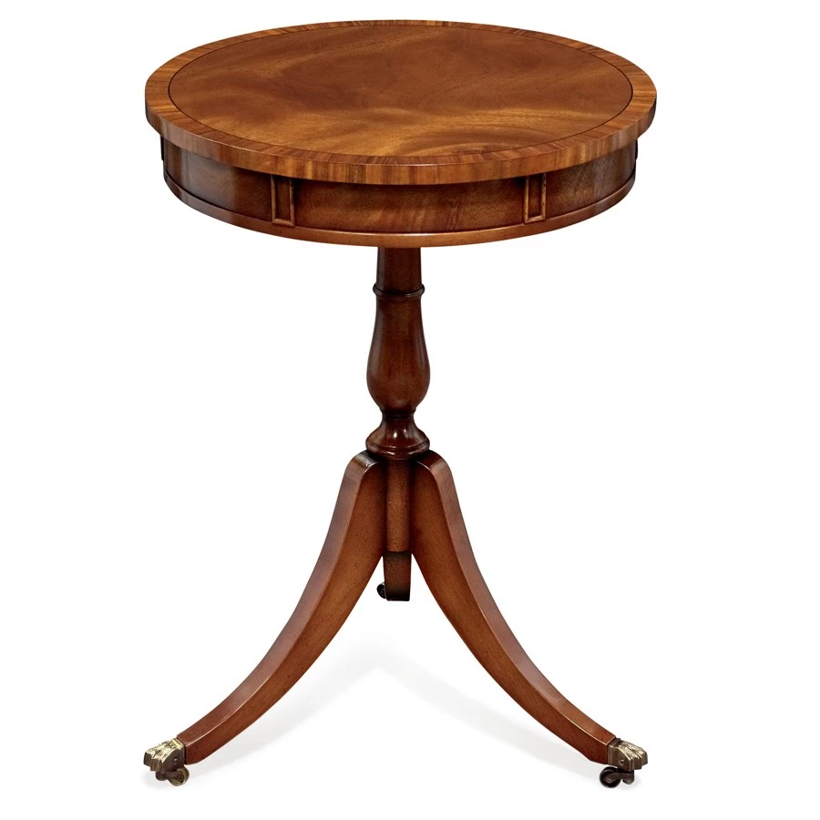 Beautiful mahogany drum table with the rose banding gives any room in the house that perfect allure. Handmade in England exclusively for Scully & Scully.