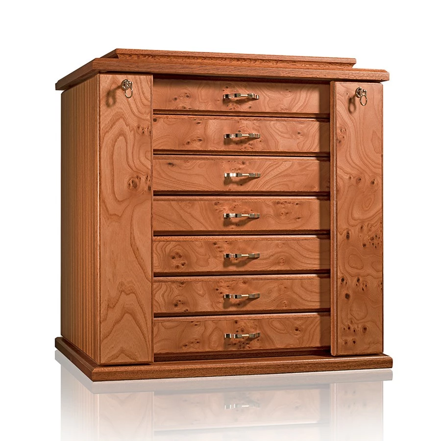 A sleek Elm Briarwood and mahogany jewelry chest that is perfect for keeping all your precious jewels safe and secure. The chest has a smooth matte finish, Ultrasuede lining, and 24k gold-plated brass accessories. Contains necklace bars, lockable doors, and six drawers, as well as an adjustable mirror on top. Made in Italy.