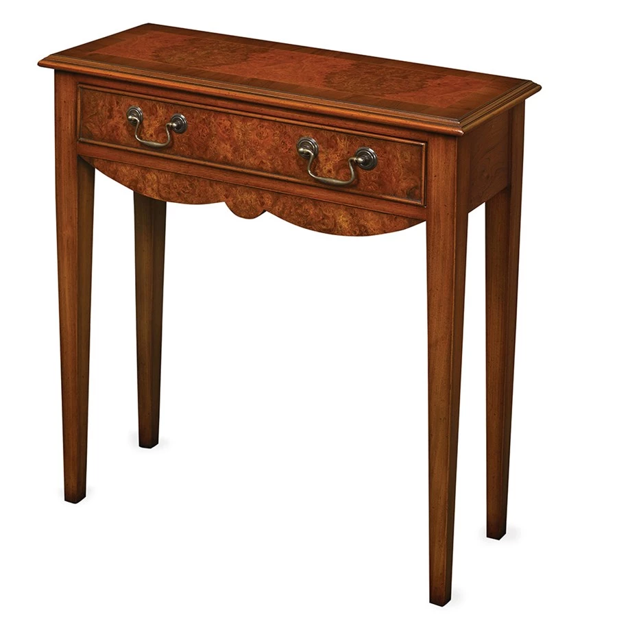 Elm Console Table with Drawer is handmade in England exclusively for Scully & Scully. The top features an inlaid mahogany border and ogee edge intriplicate for cascading effect. The front features a scalloped apron between the console table’s tapered square legs. The drawer opens by brass double swan handles.