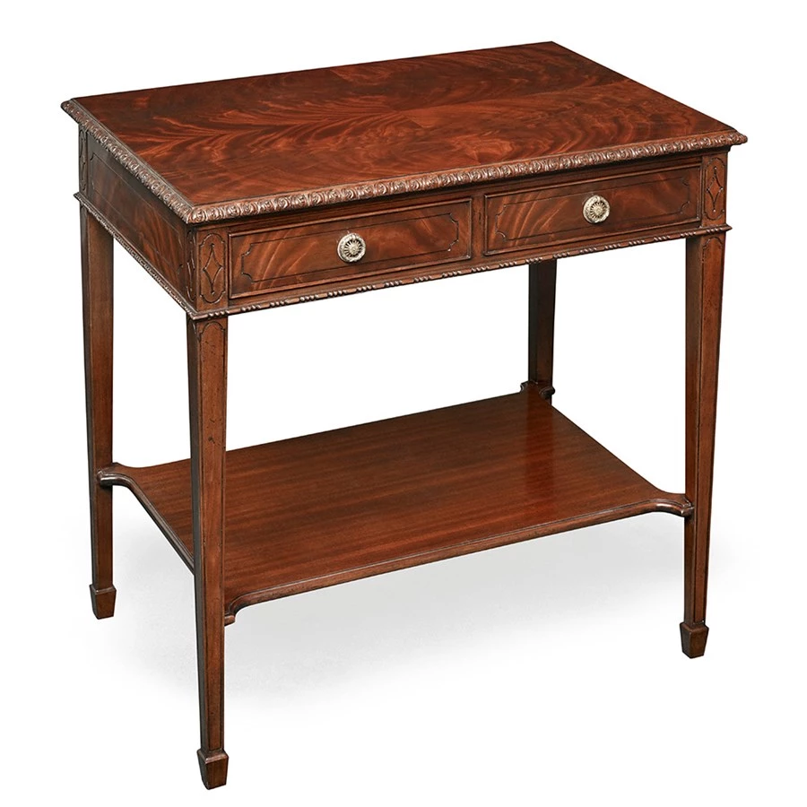 Fine flame mahogany. Rectangular top with carved edges above two frieze drawers with brass ring pull handles. Tapering legs with spade feet are joined by a concave-sided undertier. Exclusively at Scully & Scully.