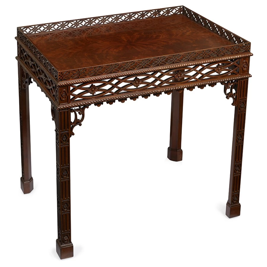 The gorgeous tea table features a fretwork gallery, pierced with concentric shapes above a fretwork frieze. The curved interlocking shapes create straight legs with fluted carvings. Fine flame mahogany. Designed by Scully & Scully and exclusively ours.