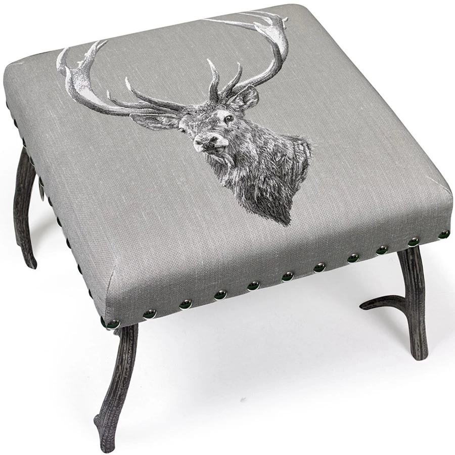 Beautiful antler stool upholstered in gray linen. Handmade in England with genuine antler legs and traditional style studding, this striking stool will be the center piece and talking point of any room.