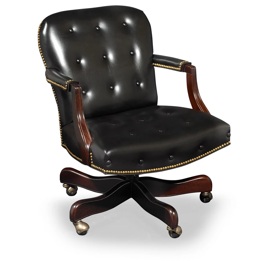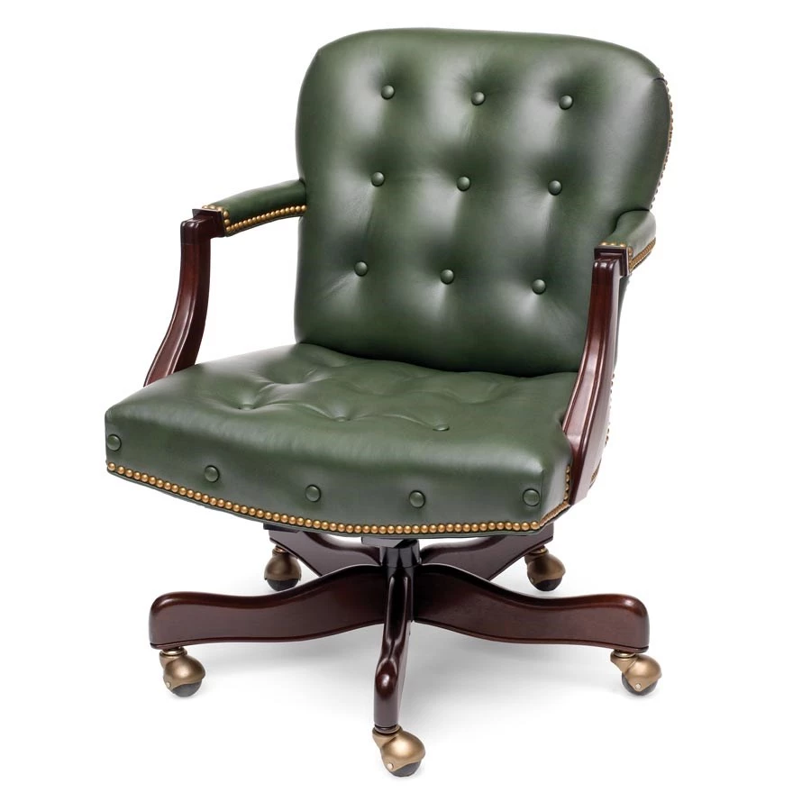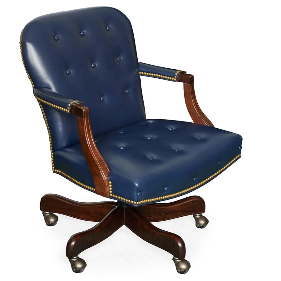 Swivels side-to-side, tilts front-to-back, and also adjusts in height. Lushly crafted and entirely handmade by master craftsmen in America. The top grain leather and special cushioning are carefully selected to retain their shape while remaining soft and comfortable with luxurious tufting. Springs hand-tied for increased durability. Hand carved and hand-sanded mahogany finished maple feet run on brass casters for adding convenience.