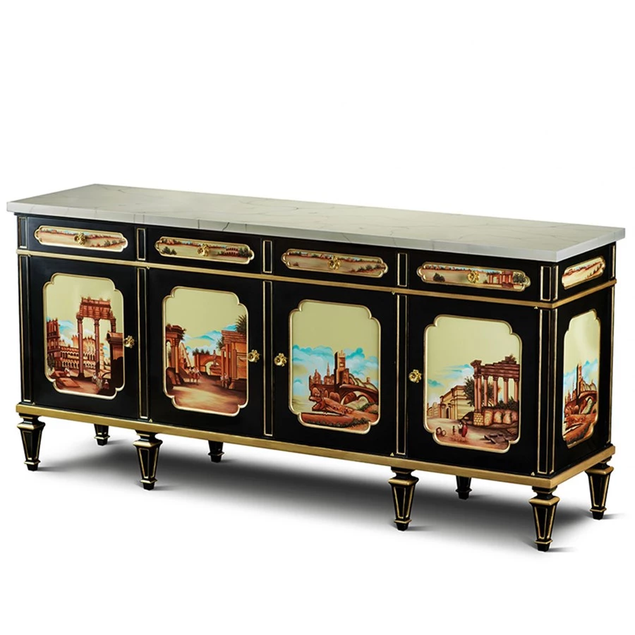 As useful as it is beautiful, intricately hand-painted historic imagery with antique brass hardware. Using the Regency style of japanning, the black lacquer illustrates the European imitation of Asian lacquer work. Four compartments with a Faux Ivory Marble Top.
