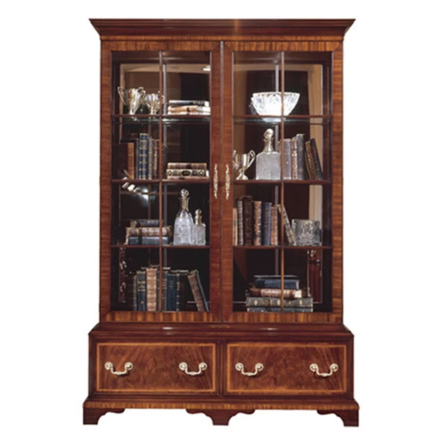Removable fully finished top panel. Solid mahogany crown mold. Flush fitting door with ribbon stripe border. Rheostat controlled lighting with mirrored back. Switch in upper left corner. Stationary center shelf frame with glass insert and two adjustable glass shelves. Shelves and wood bottom are plate grooved. Curio ends with beveled glass panes. Flush fitting drawer of swirly figured mahogany with interior border of herringbone pattern mahogany. Solid brass rococo pulls on drawer and fixed key pull with escutcheon on door. Handmade in America by the finest craftsmen.