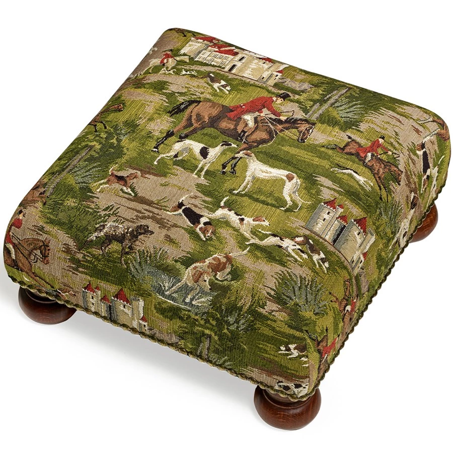 Handwoven cotton blend tapestry from France is skillfully transformed into elegant footstools with the Horses & Hounds motif. Bunn feet and traditional style studding. Made in England. Exclusively at Scully & Scully.