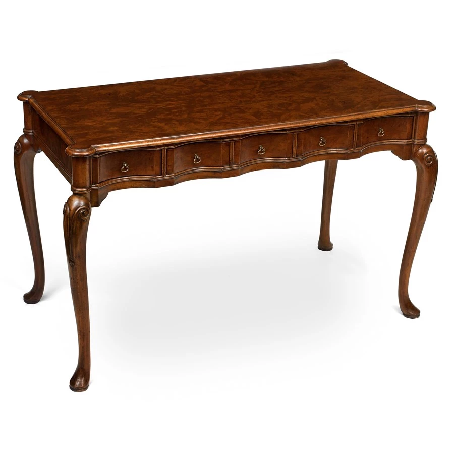 Elegantly crafted of myrtle burl with applied molding around drawer fronts, sides and graceful rounded corners. Three drawers with brass handles. Delicate carving on cabriole legs terminating in pad feet.