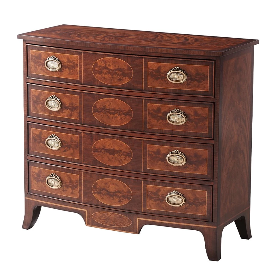 Handcrafted of mahogany, flame veneered mahogany, and walnut banded chest of drawers, the bowfront top above four oval panel inlaid drawers on splay feet. Includes ‘Anti-Tip Kit’ for securing the chest to the wall.