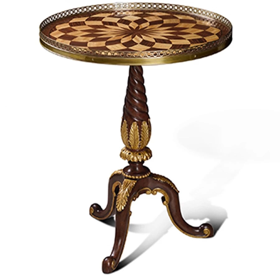 Using the finest mahogany and intricate parquetry design on the surface, this lamp table will stand out in any room. Offering regal gold guilting and a brass gallery, this item is available exclusively at Scully & Scully.