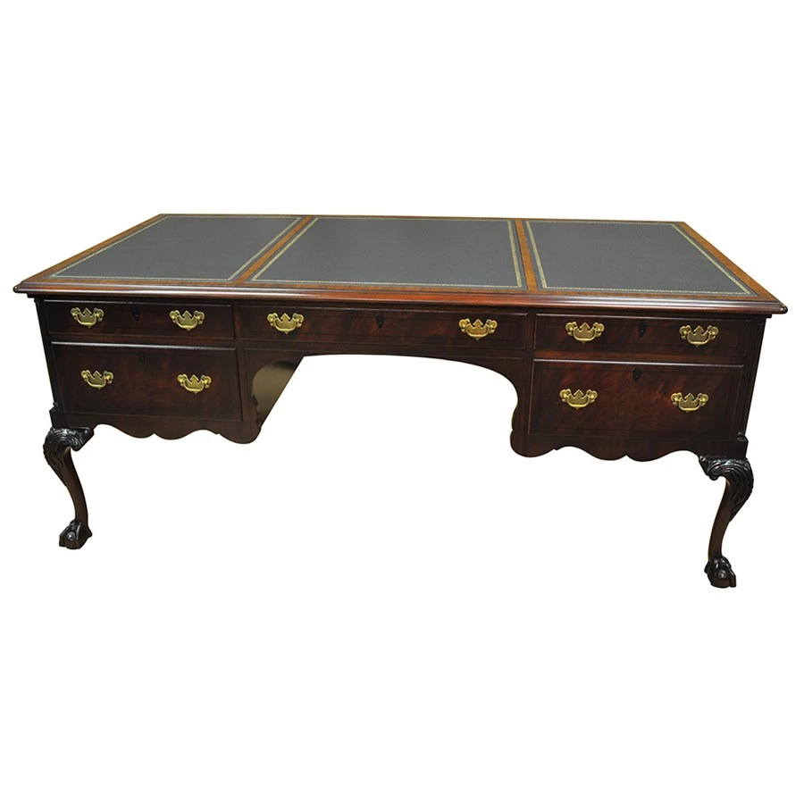 Handcrafted of mahogany, this desk boasts both mahogany and crotch mahogany veneer accents to prevent warping. The top boasts three leather panels with wood dividers. The desk also features ebony inlay and escutcheons, scalloped apron, leaf carvings on knees of cabriole legs, ball-and-claw foot, central locking device, pencil tray in central drawer, a simulated drawer effect on guest side and solid brass hardware. Each desk also includes dictation slides on each end and on the guest side. Available with optional drop front center drawer. Handmade in America.