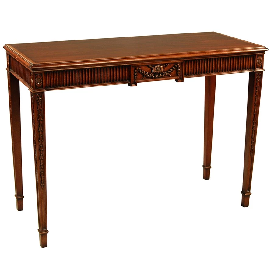 Handcrafted of mahogany with mahogany veneer to prevent warping, this console table is full of impressive details. The understated top surface is banded with inlaid tulipwood. The apron is deeply fluted and boasts a central carved center panel and corner motifs above each leg.ย The tapered square legs also feature intricate carvings and swags descend down each before terminating in spade feet. Handmade in America.