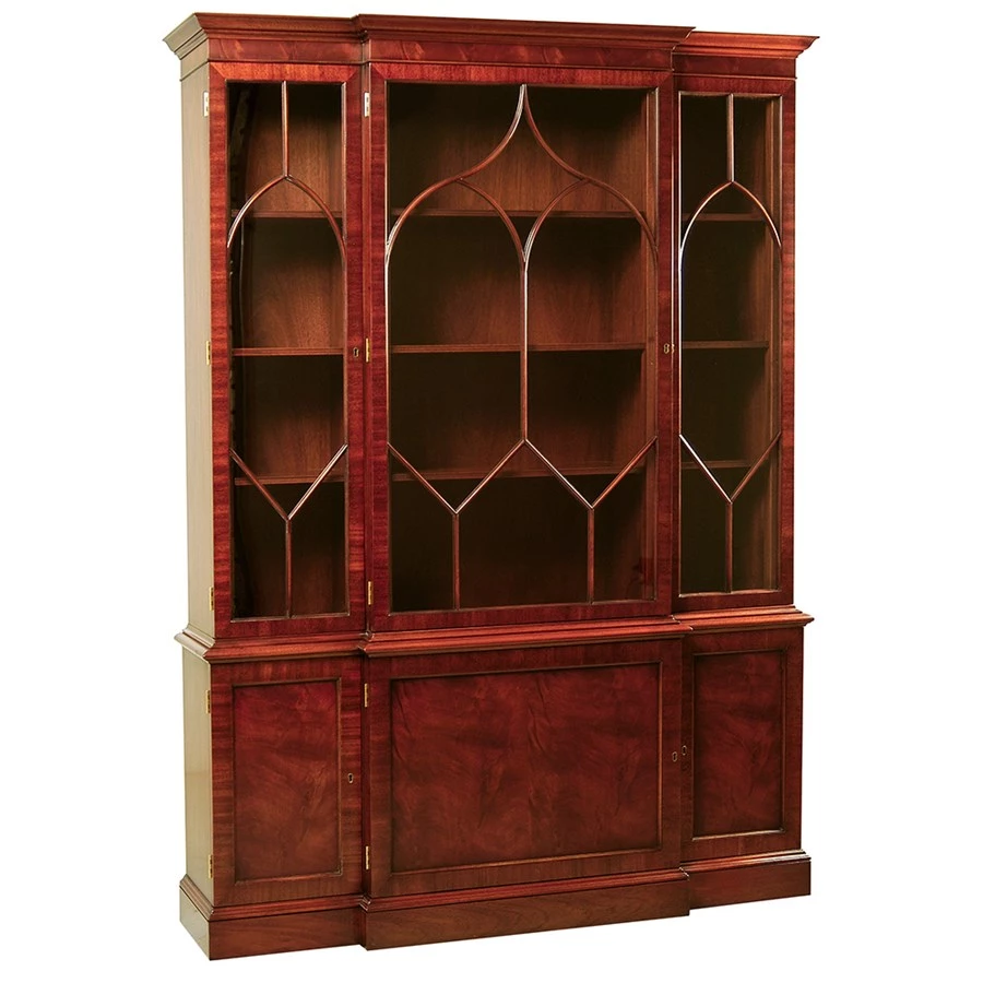 Mahogany and Mahogany veneer breakfront has three upper locking doors each with a stationary shelf and two adjustable shelves. Three lower locking cupboards each conceal an adjustable shelf. Includes interior illumination. Handmade in America.