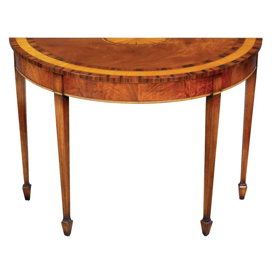 Refined half-round pier table is richly figured mahogany with satinwood inlay. Demilune top has satinwood scallop border and radiant fan inlay. Square tapered legs feature inlaid panels. Handmade in England. Exclusively at Scully & Scully.