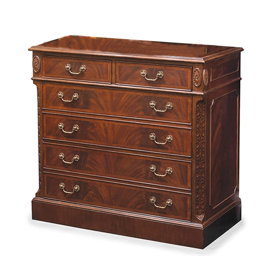 Entirely handmade with beautifully matched crotch mahogany veneers. Solid oak drawers with dovetails at front and back with carved fretwork accenting the corners. Lost-wax cast solid brass hardware and hand-rubbed finish. Exquisitely finished on the back so can be positioned in any direction. Has two regular drawers at top. Each side of each file drawer can be set for either letter or legeal width files. Removable bookshelf has three adjustable shelves. Will provide generations of use while requiring minimal care, just dusting and an occasional polishing.