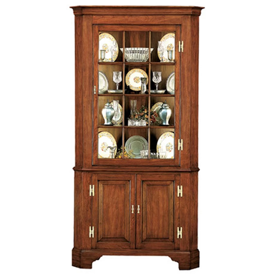 Hand fitted mullions and individually cut and glazed glass panes. Three stationary wood shelves with lighted interior in upper section. One stationary shelf in lower compartment. Solid brass hardware. Requires 31″ along each wall. Handmade in America by the finest craftsmen.