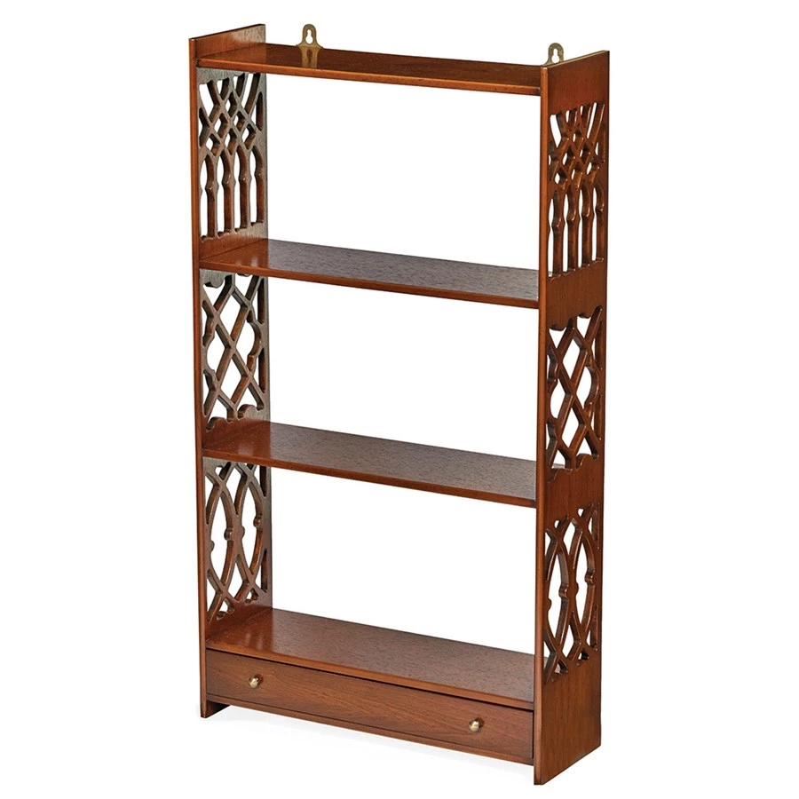 Add extra storage and display space to your home, or office, with the Mahogany Fretted Hanging Bookcase. With four shelves and a drawer, there is ample space for books and possessions. The hanging bookcase boasts beautifully fretted sides, with three distinct patterns. Can be hung using two brass fixtures on the back. Handmade in England. Exclusively at Scully & Scully.