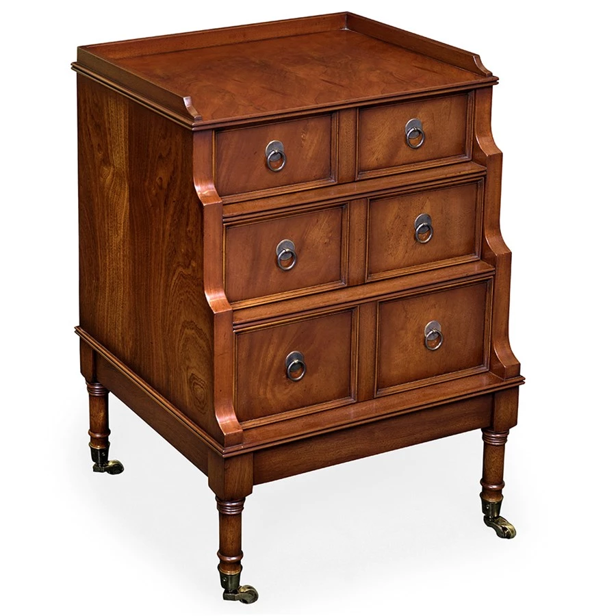 Traditional library chest is handcrafted of solid mahogany with mahogany veneers in a cascade of three spacious drawers. Each drawer features two brass ring-pulls. Brass hardware and four brass casters for easy movement. Handmade in England. Exclusively at Scully & Scully.
