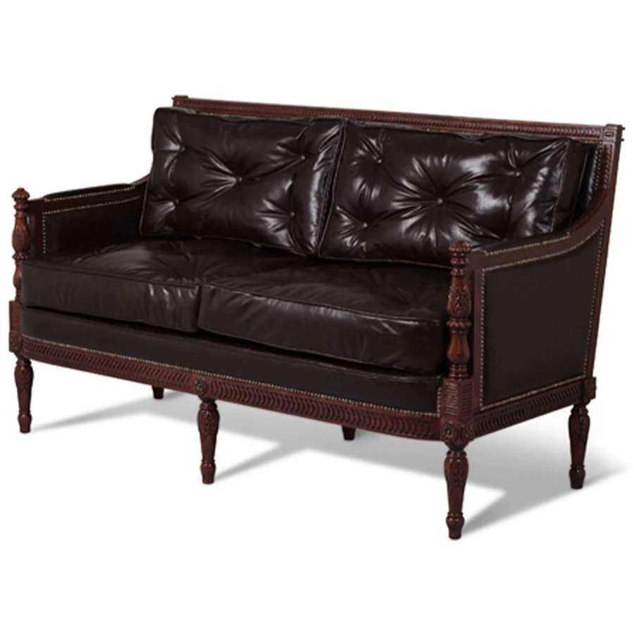 Handcrafted in solid Mahogany and fine Italian leather, this love seat will be the perfect compliment to any room. Offering tufted Italian leather on loose cushions, this piece is also detailed with fine brass nails.