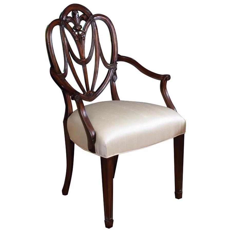 Heart Shield Back Chairs Carved polished mahogany chairs feature rosette and paterae carving on arms and back. Prince of Wales plumage with drapery swag above oyster silk upholstery. Square tapering molded front legs and shaped raking rear legs.