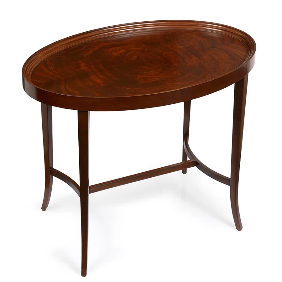 Handmade fine crotch mahogany oval tea table. Legs are interconnected by H-frame stretcher. Exclusively at Scully & Scully.