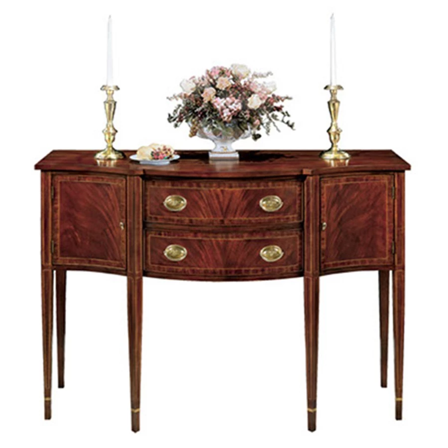 Solid mahogany top, swirly figured veneer fronts with ribbon stripe border. Hand applied bead on doors and drawers. Front legs are tapered with prima vera and anigre cuff. Silver liner in top drawer. Full storage compartment behind doors. Solid brass federal hardware and gallery.
