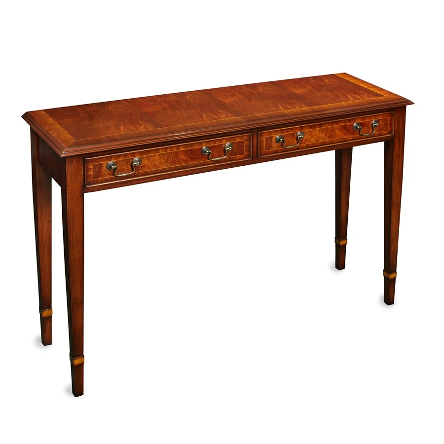Handcrafted mahogany and mahogany veneer side table features elegant tapered legs and two drawers. Handcrafted traditional brass handles are made with the lost-wax method. The perfect addition to a traditionally designed home in an entry hall or console table. Handmade in England. Exclusively at Scully & Scully.