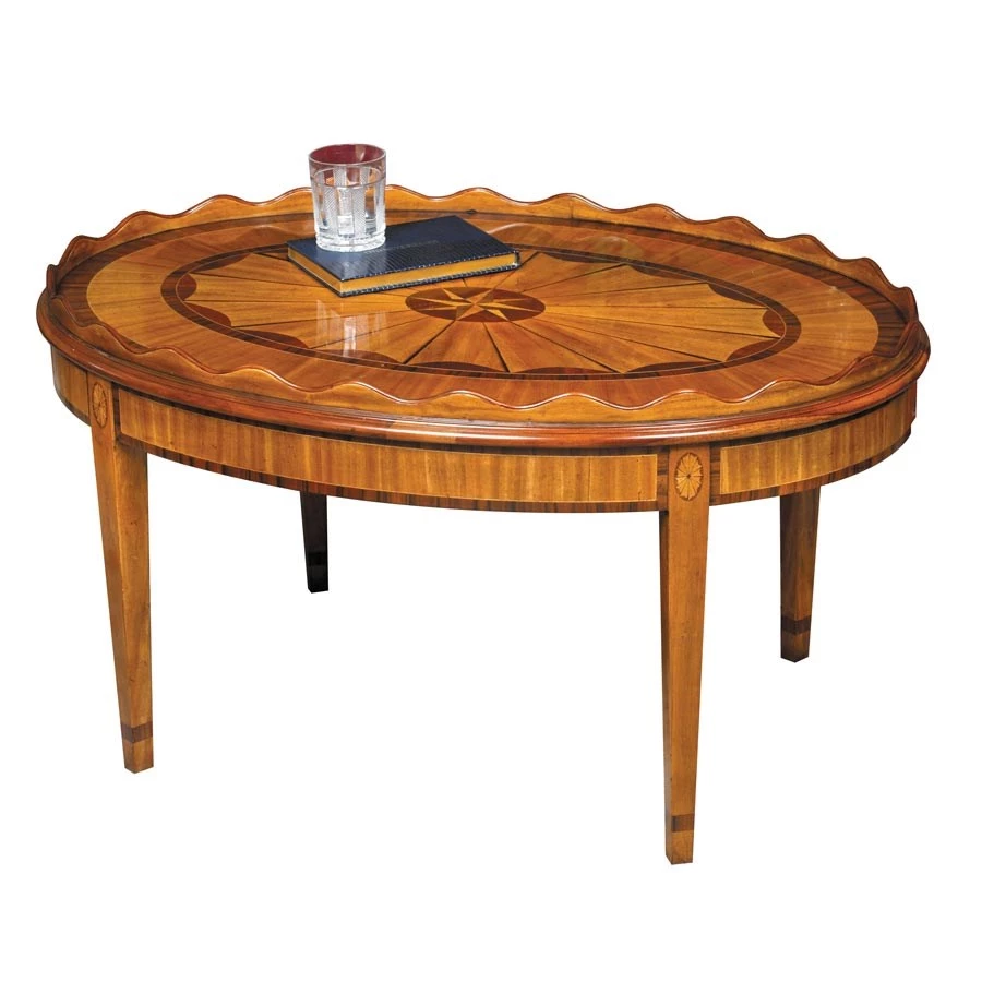 This exotically beautiful mahogany table has veneer of satinwood, primavera, mahogany and rosewood, accented with white stranded inlays. It is entirely handmade, with a handrubbed finish.