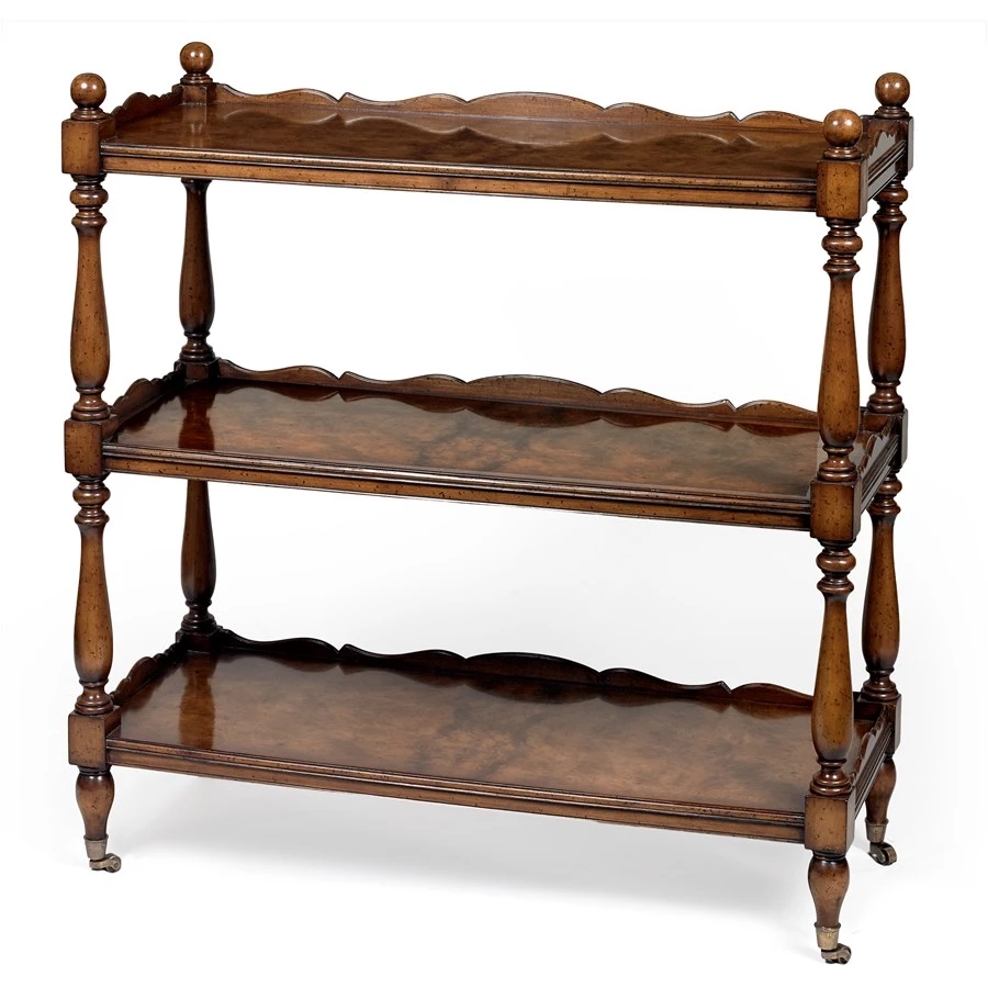 This is made of high quality myrtle burl and has 3 shelves. Comes with 4 brass casters for it to be pushed and pulled.
