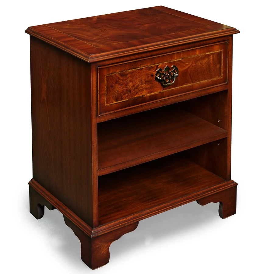 Handcrafted of mahogany with mahogany veneers, this useful bedside-, lamp-, or side table features fluted posts, a feather inlay and a square base with elegant aprons. There are two hutch-style open surfaces below the ring-pull drawer. Shelf is adjustable to three heights. The perfect multifunctional piece for any room. Handmade in England. Exclusively at Scully & Scully.