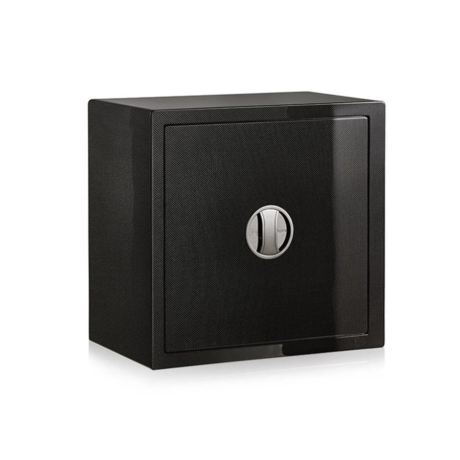 Safe covered in polished carbon with white leather-lined drawers for jewelry/watches. Ruthenium accessories and a round handle with a biometric opening and integrated emergency key system. Handmade in Italy.