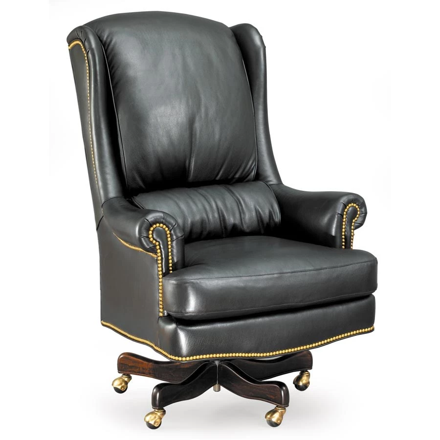 Entirely handmade by master craftsmen in America. Top grain leather and special cushioning are carefully selected to retain their shape while remaining soft and comfortable. Springs are hand-tied for increased durability, and brass casters provide additional convenience. The wood is mahogany, hand-carved and hand-sanded to a silky touch. Not only does this chair swivel side-to-side and tilt front-to-back, but also it is adjustable in height.