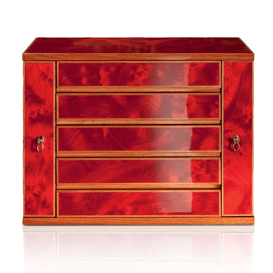 Polished red burlwood jewelry chest can be placed on a surface or anchored to the wall. Five drawers with two pullout necklace bars. Front two doors lock with key. Handmade in Italy with tarnish-free ultrasuede lining. Screws included for concrete walls and wooden studs.