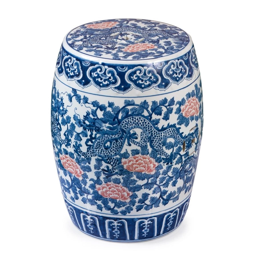 Lush and colorful handpainting on a handmade Chinese porcelain garden seat. Useful as a stool or as an extra table surface.