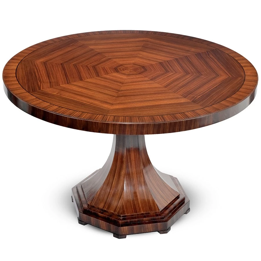 Santos Rosewood is one of the worldโs most prized woods because of its even texture and relatively straight grain, as evidenced on this stunning pedestal dining table with antique rosewood finish.