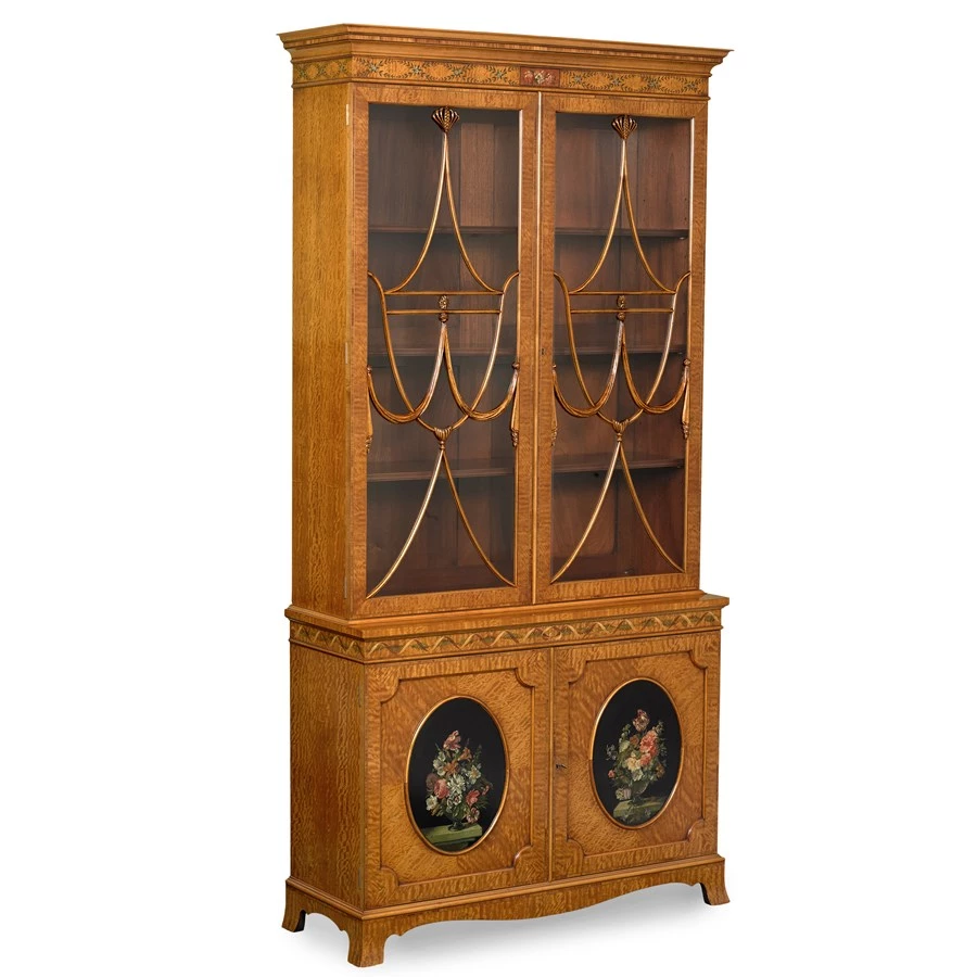Hand-decorated satinwood china cabinet. Top section has two glass-front doors with elaborate carved vase glazing and interior lighting. The bottom section has two paneled doors with oval decorated insets, decorated cornice & frieze, and splay feet. Both sets of doors can be locked. Handmade in England. Exclusively at Scully & Scully.