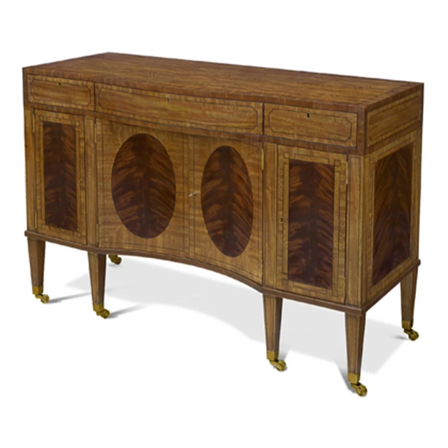 Handcrafted of satinwood with English finish crotch mahogany accents. This bow front sideboard stands on six legs with convenient brass casters for maneuvering. Includes three drawers and four cupboard doors, all fitted with brass locks.