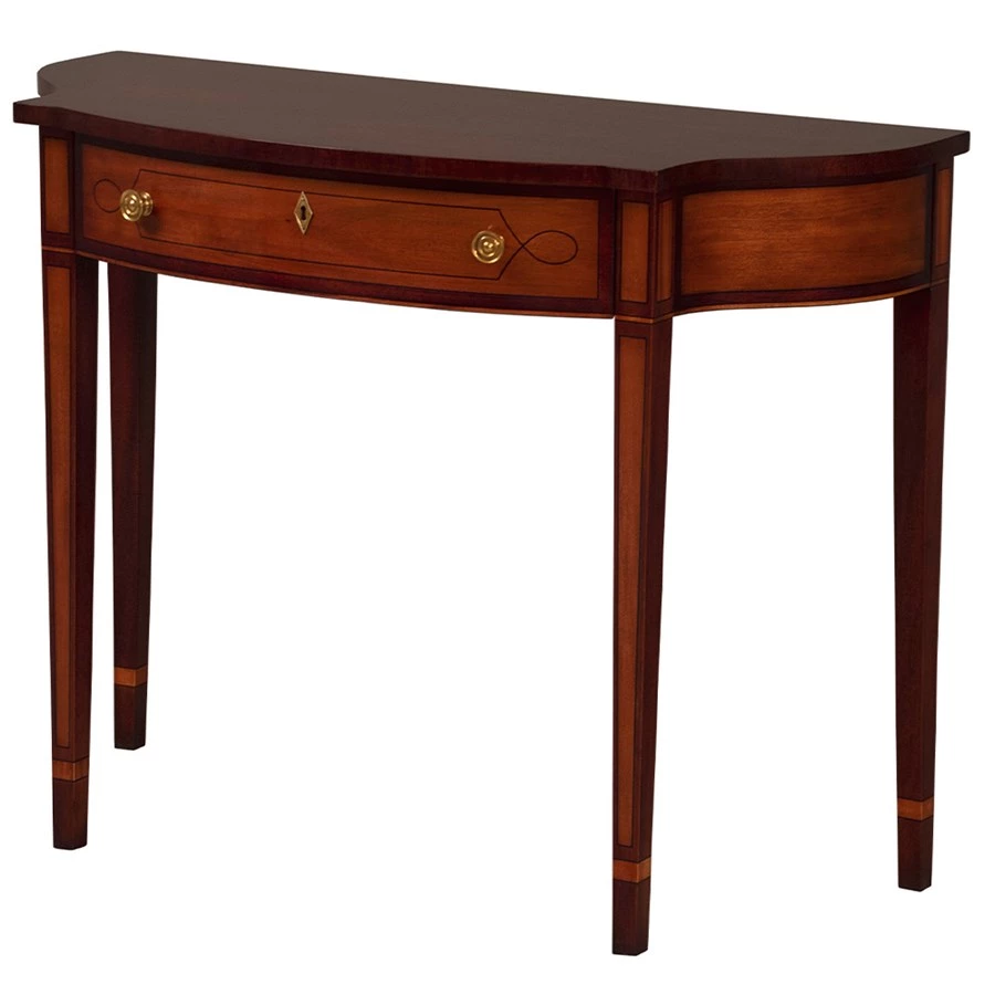 Handcrafted of solid mahogany with satinwood and figured mahogany veneers. The drawers and aprons are mahogany border banded and caarefully inlaid with ebony stringing on satinwood to impressively seamless effect. The tapered legs are cuff banded with a five piece inlay. The single locking drawer has solid brass hardware. Handmade in America.